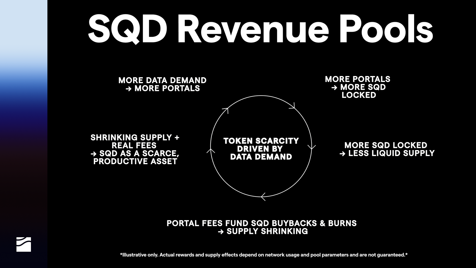 Stronger demand for data → more Portals → more fees → more SQD locked and SQD-denominated rewards bought with Portal fees → better supply management → a stronger value balance of SQD → more data in the SQD Network → more consumers.
